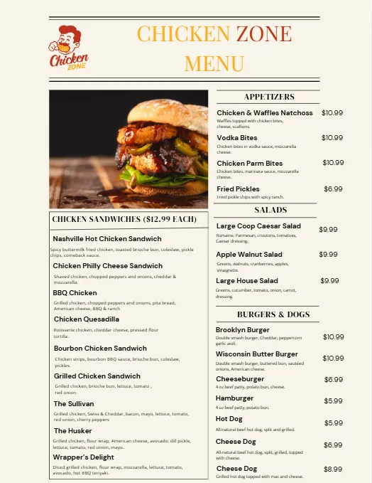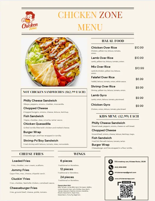 Immerse yourself in the bold flavors of Chicken Zone with our extensive menu of freshly made chicken dishes. From crispy tenders and juicy wings to loaded fries and signature sandwiches, we serve up a diverse range of flavors made with the freshest ingredients and recipes crafted for real chicken lovers. At Chicken Zone, every bite brings you closer to the taste you crave.